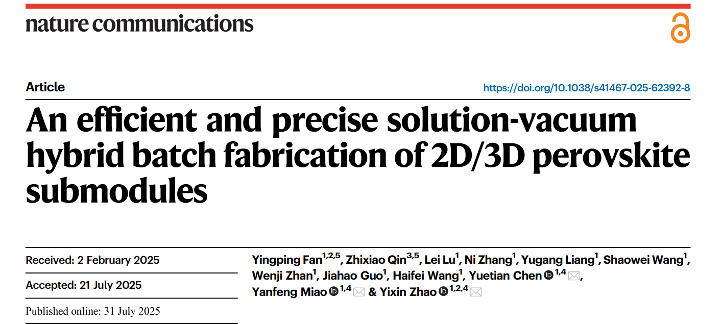 2024 2023 2022 2021 2020 2019 2018 2017 2016 2015 209. Guo, Q.; Huang, B.; Bo, G.; Ma, H.; Wen, Y.; Long, X.; Qian, X.*; Zhao, Y.* Molecular Engineering of Wastewater Nickel into Single-Site Electrocatalysts for Hydrogen Peroxide Production with Industrial Level Current. Angew. Chem. Int. Ed. 2025, 10.1002/anie.202514519. 208. Fan, Y.; Qin, Z.; Lu, L.; Zhang, N.; Liang, Y.; Wang, S.; Zhan, W.; Guo, J.; Wang, H.; Chen, Y.*; Miao, Y.*; Zhao, Y.* An efficient and precise solution-vacuum hybrid batch fabrication of 2D/3D perovskite submodules. Nat. Commun. 2025, 16, 7019. 207. Wen, Y.; Fang, Y.; Huang, B.; Zhang, T.; Cai, C.; Niu, B.; Wang, H.; Guo, Q.; Ding, S.; Yao, G.; Qian, X.*; Zhao, Y.* Scalable carbonization of waste plastics for producing nitrogen-doped carbon for efficient hydrogen peroxide electrosynthesis. J. Energy. Chem. 2025, 108, 181. 206. Wang, H.; Li, B.; Liu, F.; Zhan, W.; Feng, M.; Guo, J.; Wang, S.; Liang, Y.; Fan, Y.; Chen, Y.*; Miao, Y.*; Zhao, Y.* 2D Capping Layer Passivation toward Inorganic CsPbI3 Perovskite Minimodule. Adv. Funct. Mater. 2025, 35, 2423397. 205. Li, X.; Sun, J.; Ma, H.; Long, X.; Li, T.; Shimoyama, Y.; Naito, T.; Sato, K.; Yamada, H.; Nagaoka, K.*; Zhao, Y.*; Qian, X.* Efficient metallic Ni as a bifunctional electrocatalyst for integrating continuous PET plastic upcycling with hydrogen production. Appl. Catal. B 2025, 371, 125211. 204. Wang, Y.; Li, B.; Wang, H.; Zhang, Z.; Dang, Z.; Miao, Y.; Ma, K.; Qin, Z.; Lu, L.; Zhang, N.; Wang, Y.*; Chen, Y.*; Zhao, Y.* A Soft Nonpolar-Soluble Two-Dimensional Perovskite for General Construction of Mixed-Dimensional Heterojunctions. Adv. Mater. 2025, 37, 2419750. 203. Cao, J.; Zhan, W.; Ren, M.; Wang, Y.; Wang, H.; Zhang, N.; Chen, Y.; Wang, T.*; Miao, Y.*; Zhao, Y.* High-Brightness Perovskite Light-Emitting Diodes with Suppressed Efficiency Roll-off Using the Green Solvent γ-Valerolactone. ACS Nano 2025, 19, 9, 9053. 202. Liang, Y.; Fan, Y.; Qin, Z.; Lu, L.; Wang, H.; Ren, M.; Liu, F.; Miao, Y.; Chen, Y.*; Zhao, Y.* Colloidally uniform single-crystal precursors enable uniform FAPbI3 films for efficient perovskite submodules. Chem. Sci. 2025, 16, 4066. 201. Zhan, W.; Cao, J.; Wang, H.; Ren, M.; Feng, M.; Fan, Y.; Guo, J.; Wang, Y.; Chen, Y.*; Miao, Y.*; Zhao, Y.* Acidic Engineering on Buried Interface toward Efficient Inorganic CsPbI3 Perovskite Light-Emitting Diodes. Nano Lett. 2025, 25, 4, 1593.